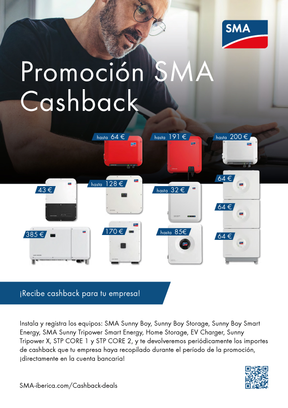 Como instalador fotovoltaico, recibe importes de cashback para por los dispositivos SMA Home Energy Solution Sunny Tripower Smart Energy, SMA Home Storage y SMA EV Charger y STP Core 2 tan pronto como estén instalados y registrados estos dispositivos. El período de promoción comienza el 01.03.2024 y finaliza el 30.09.2024. ¡ATENCIÓN! Ampliado hasta el 31 de diciembre! SMA pagará periódicamente los importes de cashback que hayas recopilado durante el período de la promoción, ¡directamente en tu cuenta bancaria!