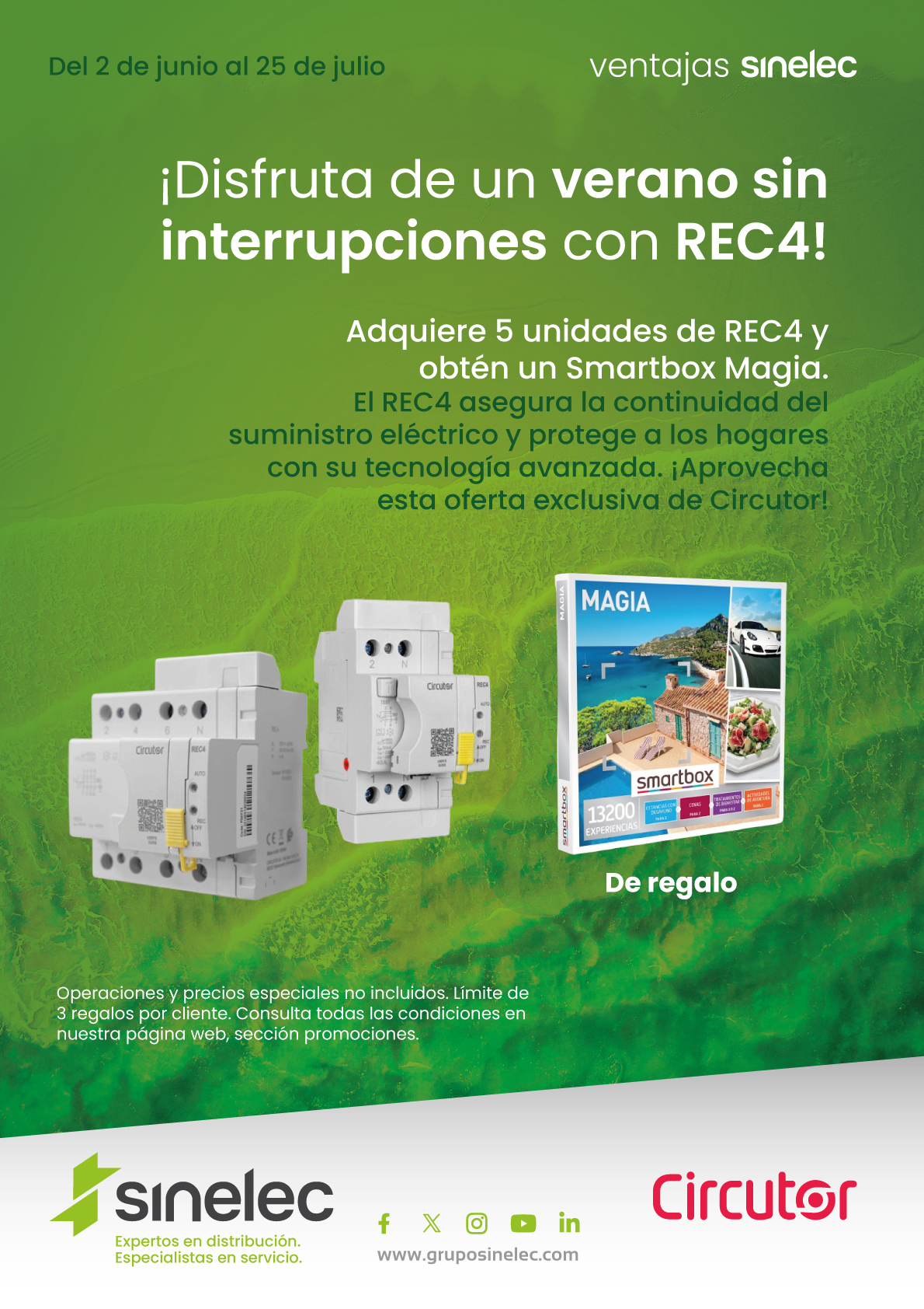 Compra 5 unidades de REC4 (referencias seleccionadas) y llévate un Smartbox Magia de regalo. El REC4 de Circutor asegura la continuidad del suministro eléctrico con reconexión automática, ideal para evitar cortes en segundas residencias.