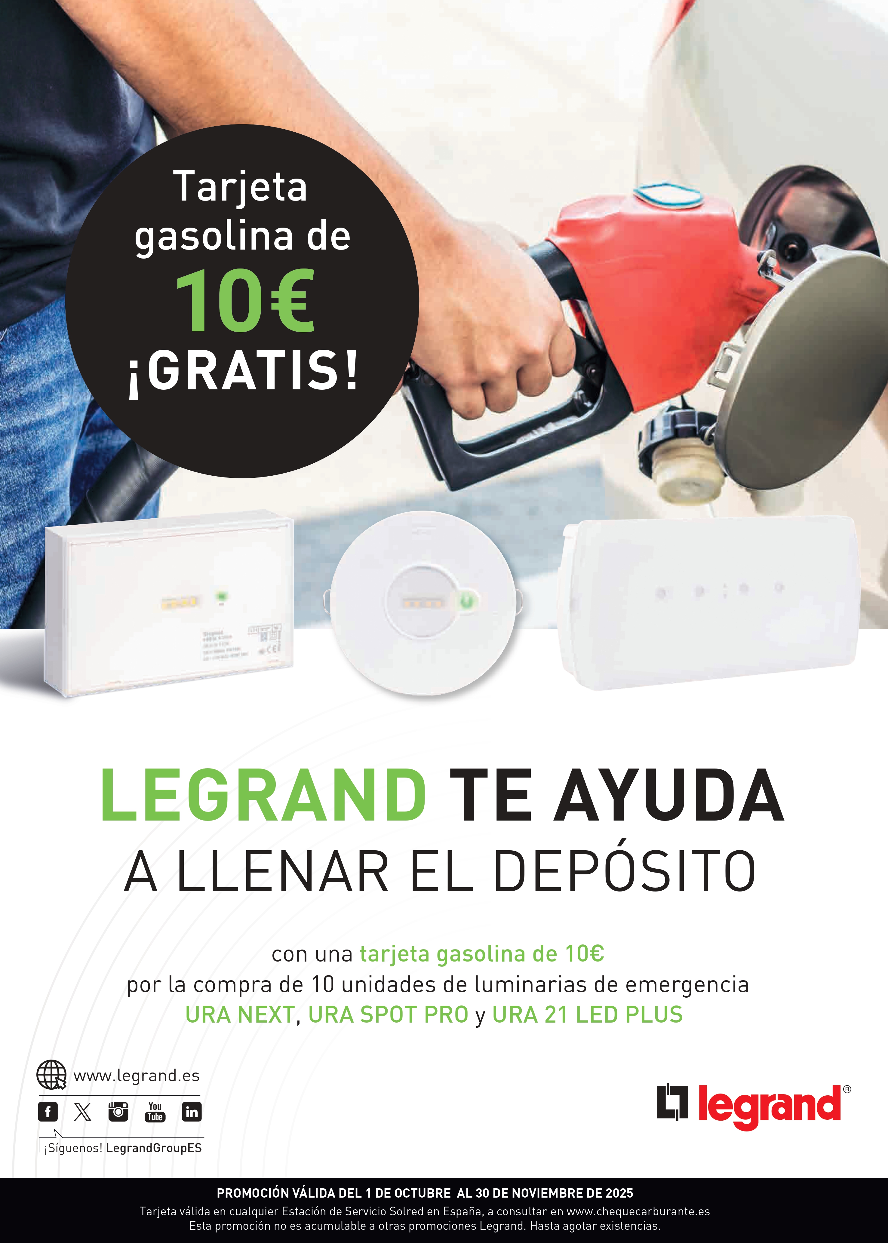 Por la compra de 10 luminarias de emergencia URA NEXT, URA SPOT PRO y URA 21 LED PLUS, Legrand te regala una tarjeta de gasolina de 10 € válida en estaciones Solred de toda España.
