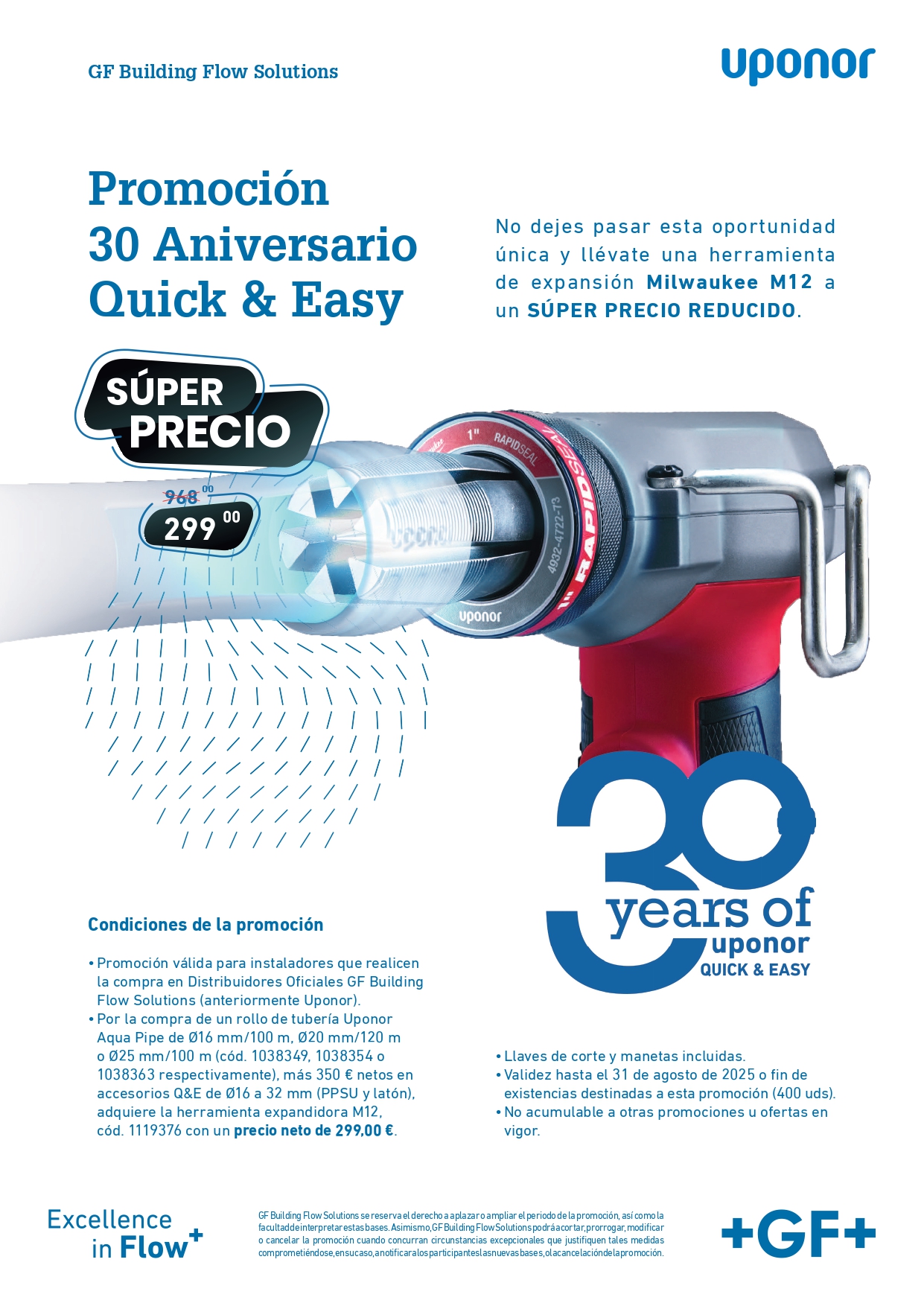 Consigue la herramienta expandidora Milwaukee M12 por solo 299 € netos al comprar 1 rollo de tubo Aqua Pipe de Ø16/100 m, Ø20/120 m o Ø25/100 m (códigos 1038349, 1038354 o 1038363), más 350 € netos en accesorios Quick & Easy de Ø16 a 32 mm (PPSU y latón). Llaves de corte y manetas incluidas.